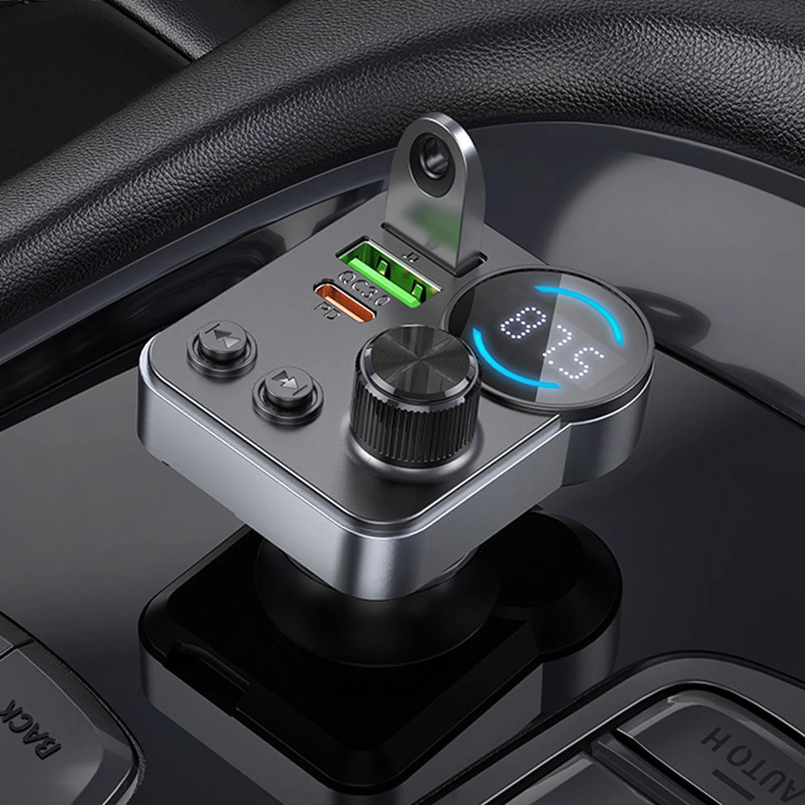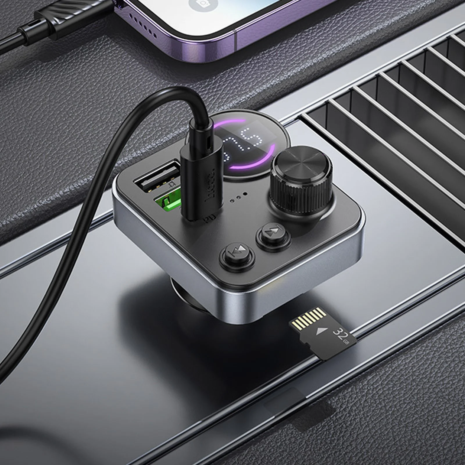 Универсальное автомобильное зарядное устройство с FM-модулятором, обеспечивающее быструю зарядку и удобное воспроизведение музыки в автомобиле.