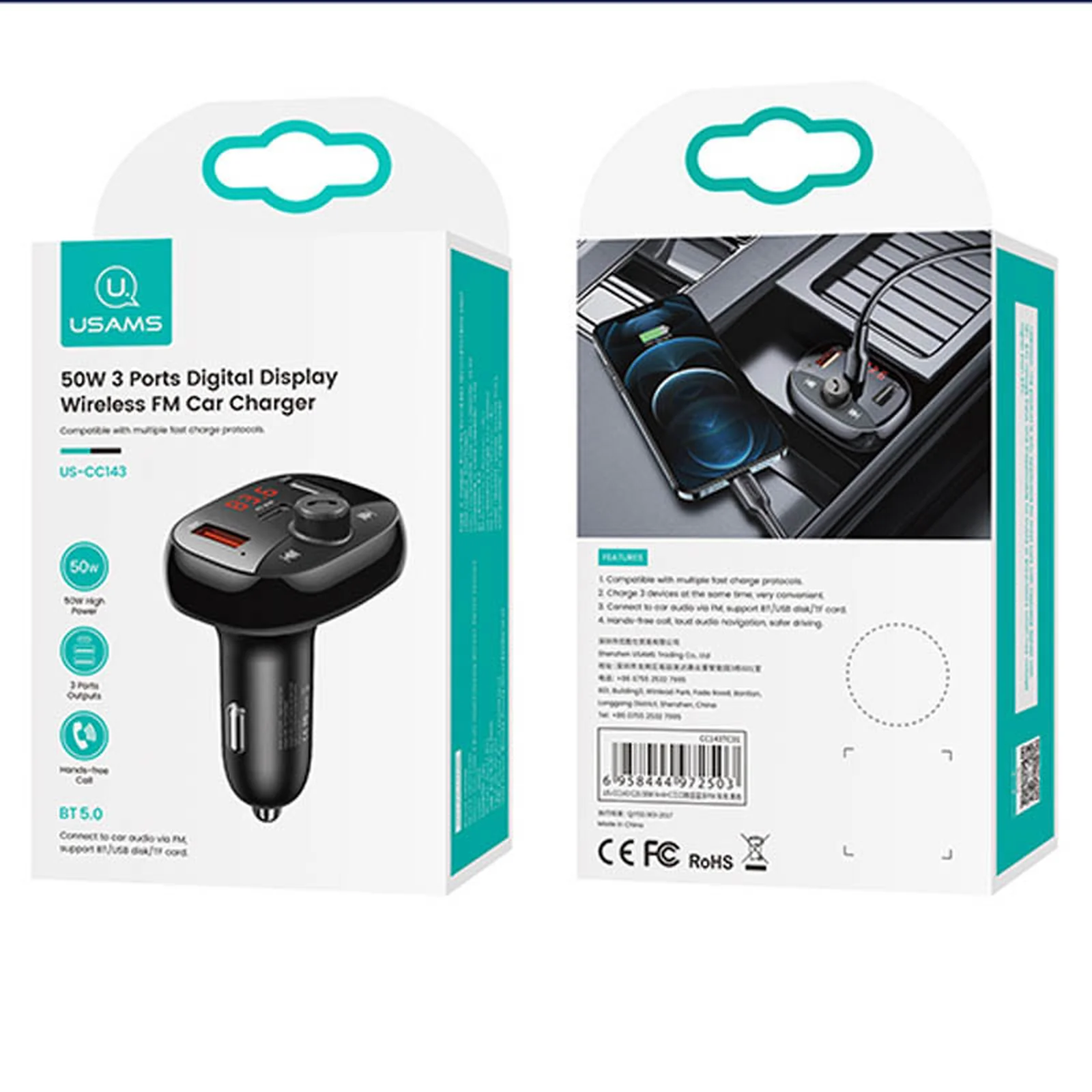 АЗУ Usams US-CC143 C25 50W 2A+C 3 Ports Digital Display Wireless FM Car Charger Черный