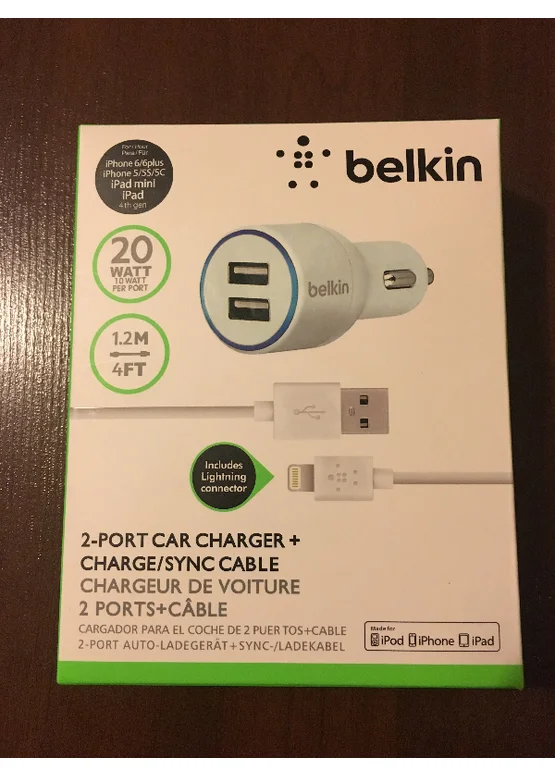 Автомобильная зарядка АЗУ "Belkin" 2A белая на 2 USB + Lightning кабель