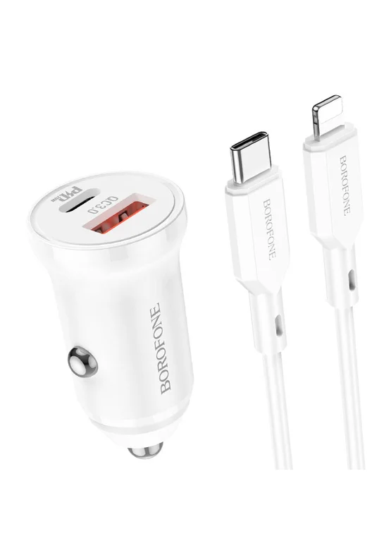 Автомобильное зарядное устройство Borofone BZ18A PD20W+QC3.0 + Type-C to Lightning - надежный и мощный спутник в дальних поездках. Совместимость с различными устройствами, включая iPhone, iPad, Samsung, Xiaomi и другие, делает его универсальным и удобным инструментом для зарядки девайсов прямо в автомобиле. Одна из главных преимуществ Borofone BZ18A - это два порта зарядки. Первый порт работает на технологии PD20W, позволяющей быстро заряжать совместимые устройства. Второй - на технологии QC3.0, которая также обеспечивает быструю зарядку, но уже для устройств, не совместимых с PD20W. Кроме этого устройство оснащено кабелем Type-C to Lightning, который позволяет заряжать iPhone и iPad совместимые устройства. Это делает Borofone BZ18A еще более универсальным и удобным в использовании. Зарядное устройство выполнено в белом цвете, что придает ему стильный и современный вид.