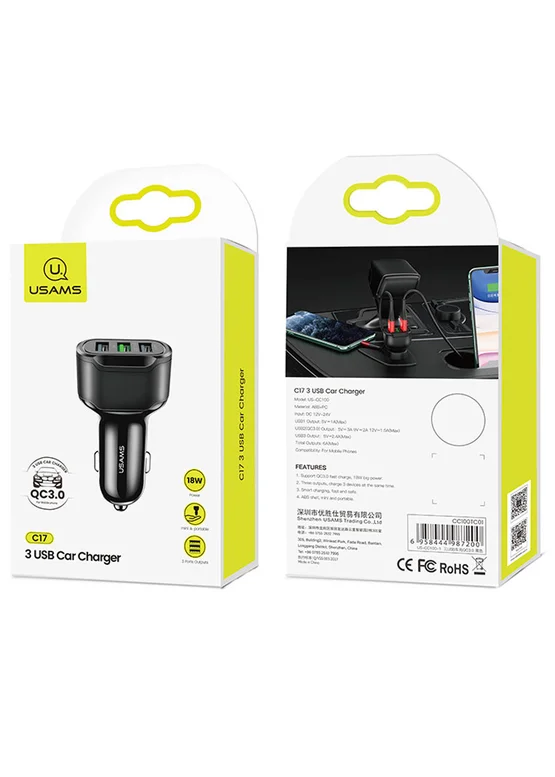 АЗУ Usams US-CC100-1 C17 3 USB (5V2.4A/5V1A/QC3.0) (Черный)