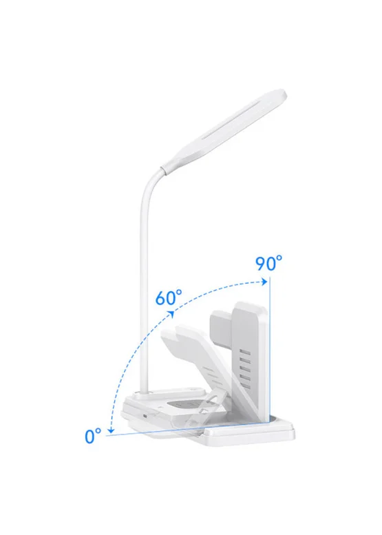 Максимальная мощность беспроводной зарядки для телефона составляет 15 Вт, для наушников — 5 Вт, а для часов — 4 Вт. Настольная лампа имеет максимальную мощность 3 Вт, обеспечивая мягкое освещение рабочего пространства.