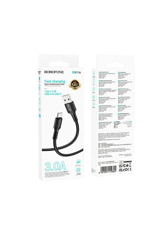 Дата кабель Borofone BX116 Certain USB to Type-C 3A (1m) Black