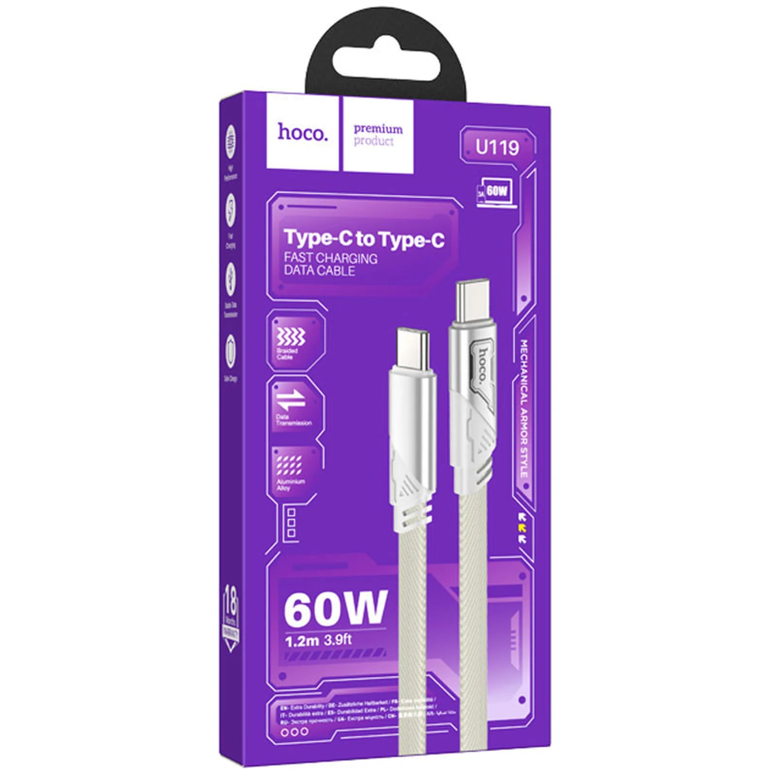 Дата кабель Hoco U119 Machine charging data Type-C to Type-C 60W (1.2m) Gray
