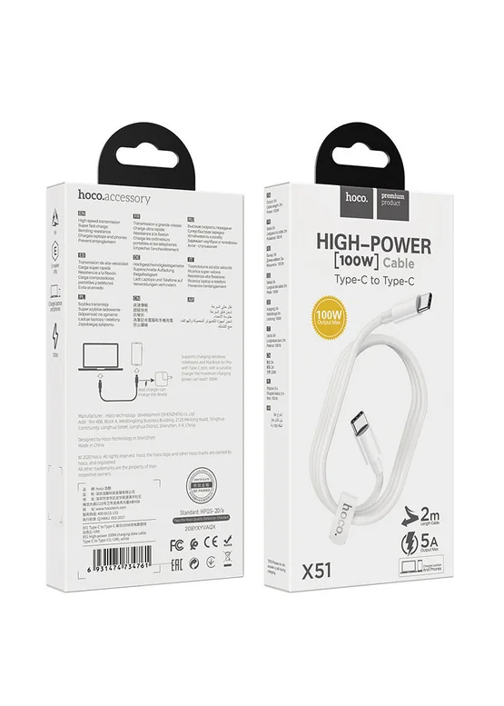Дата кабель Hoco X51 "High-power" Type-C to Type-C 100W (2m) Белый