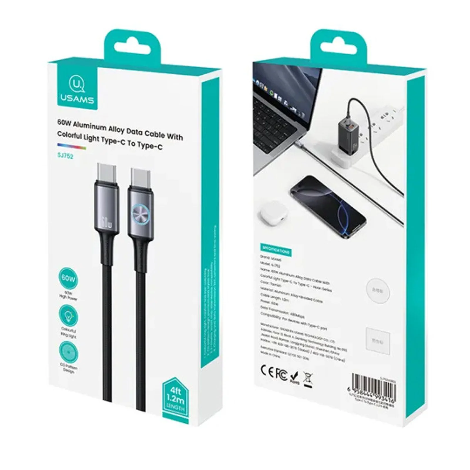Дата кабель Usams US-SJ752 With Colorful Light Huan Ser. Type-C to Type-C 60W (1.2m) Tarnish