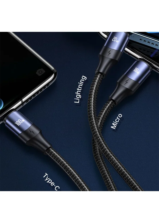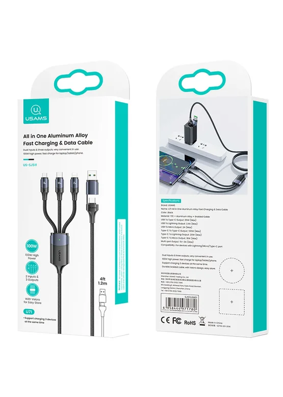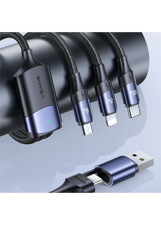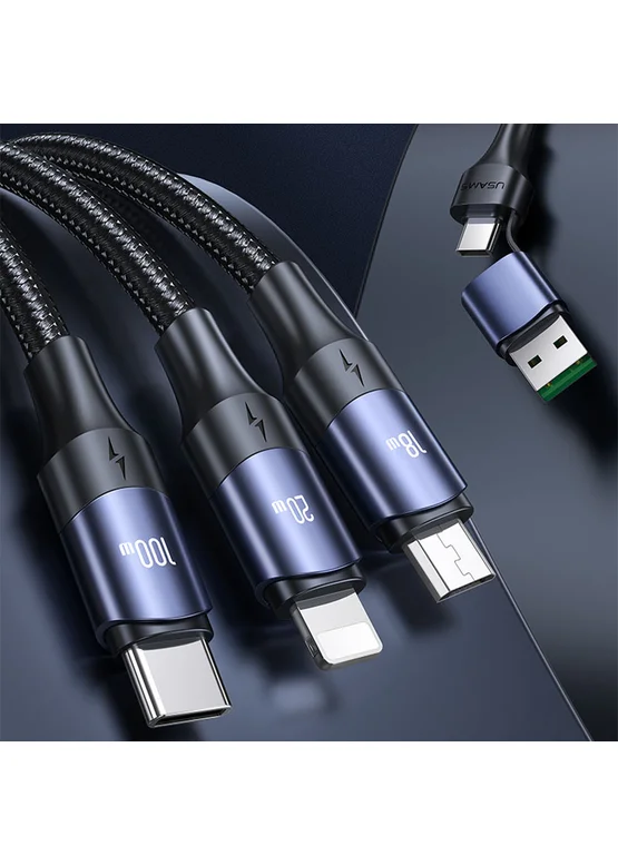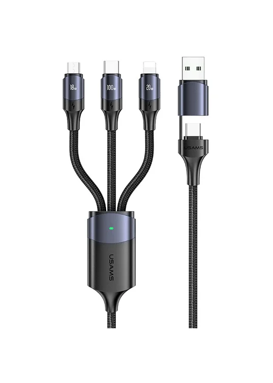 Дата кабель Usams US-SJ511 U71 All in One Aluminum Alloy USB + Type-C to Triple Head 3in1 100W(1.2m) Black