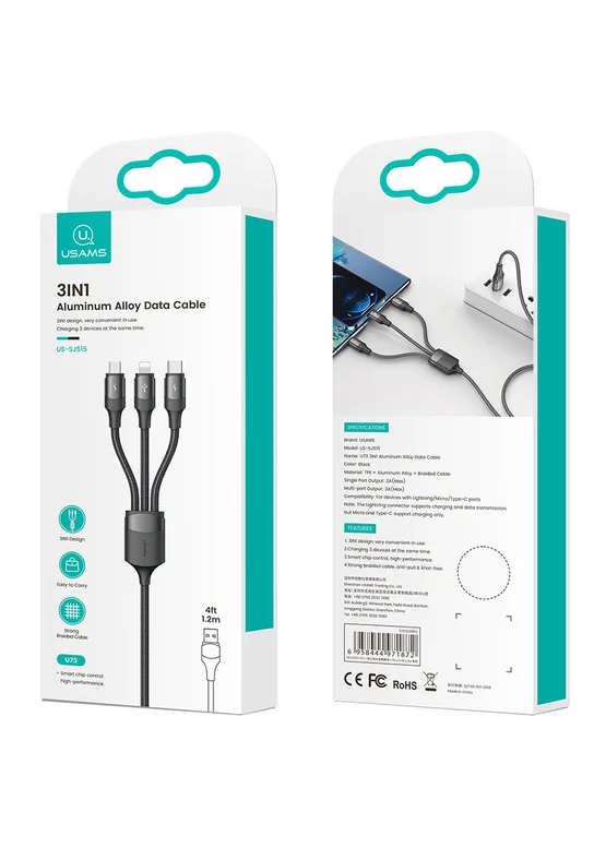 Дата кабель Usams US-SJ515 U73 3IN1 Aluminum Alloy Cable 1.2m Черный