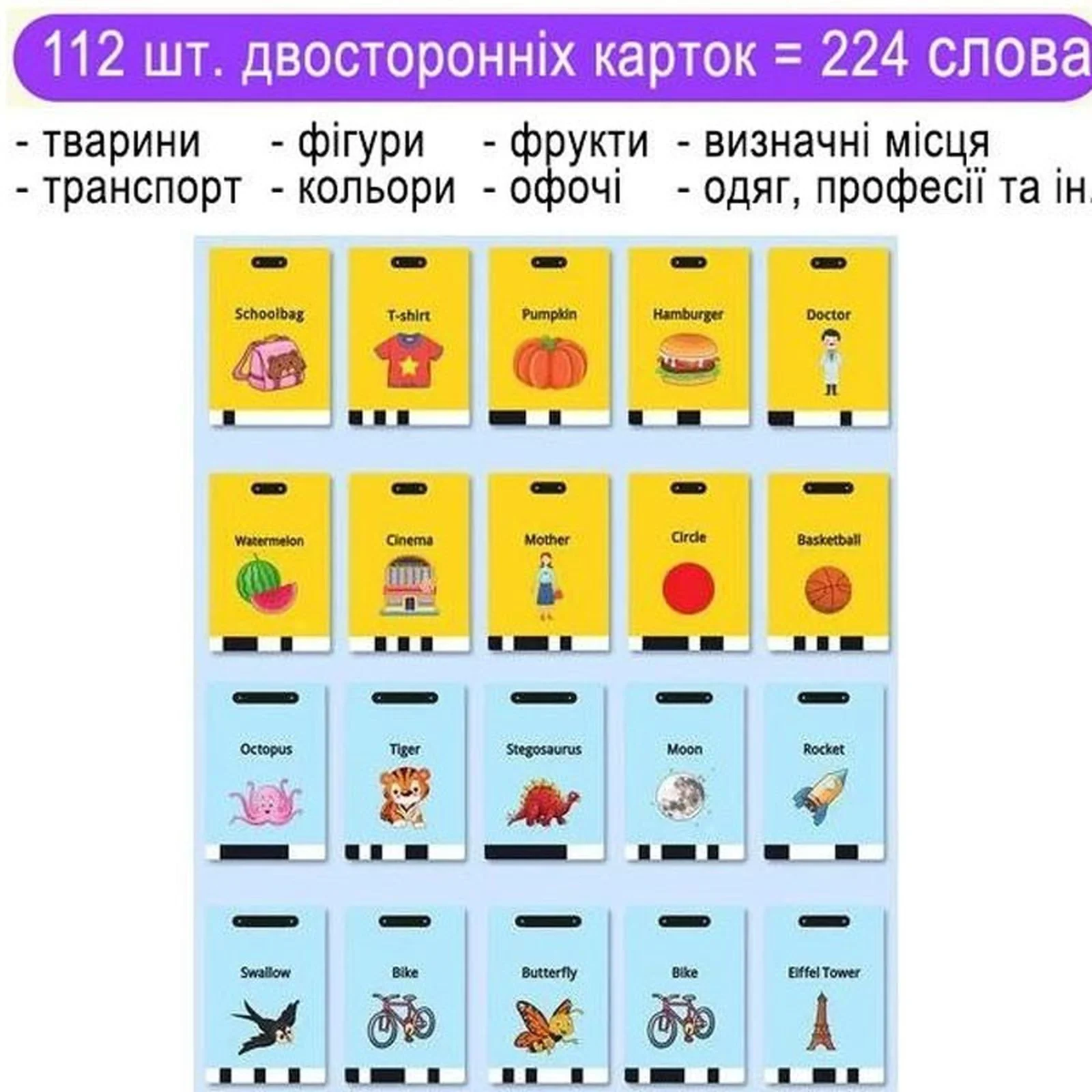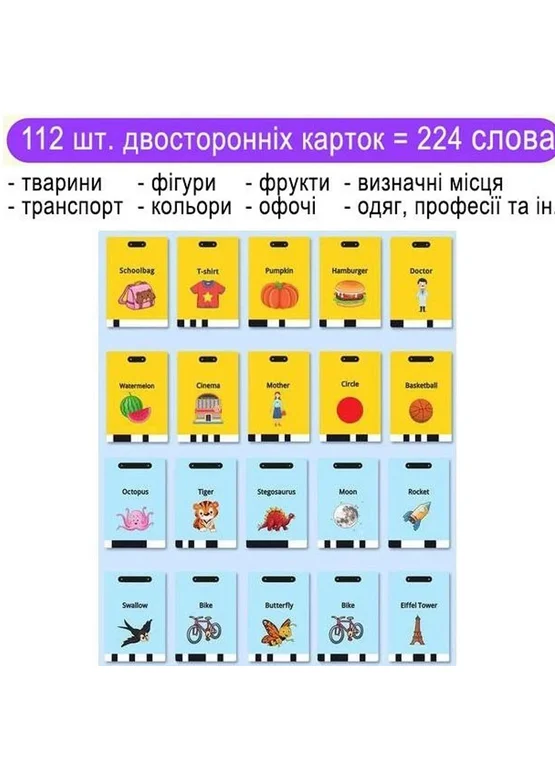 Содержит 112 двусторонних карточек с изображением 224 слов на английском языке, охватывающих различные темы, такие как персоны, цвета, формы, животные, еда, фрукты, овощи, одежда, природа, профессии, транспортные средства и другие