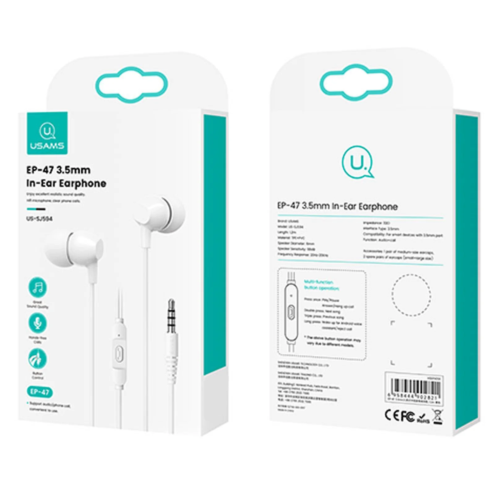 Наушники Usams US-SJ594 EP-47 с микрофоном (3.5mm/1.2m) White