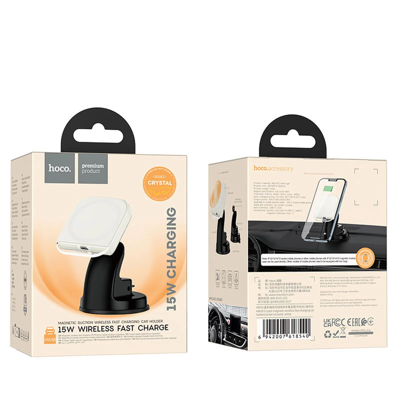 Автодержатель с БЗУ Hoco HW18 Crystal (center console) White