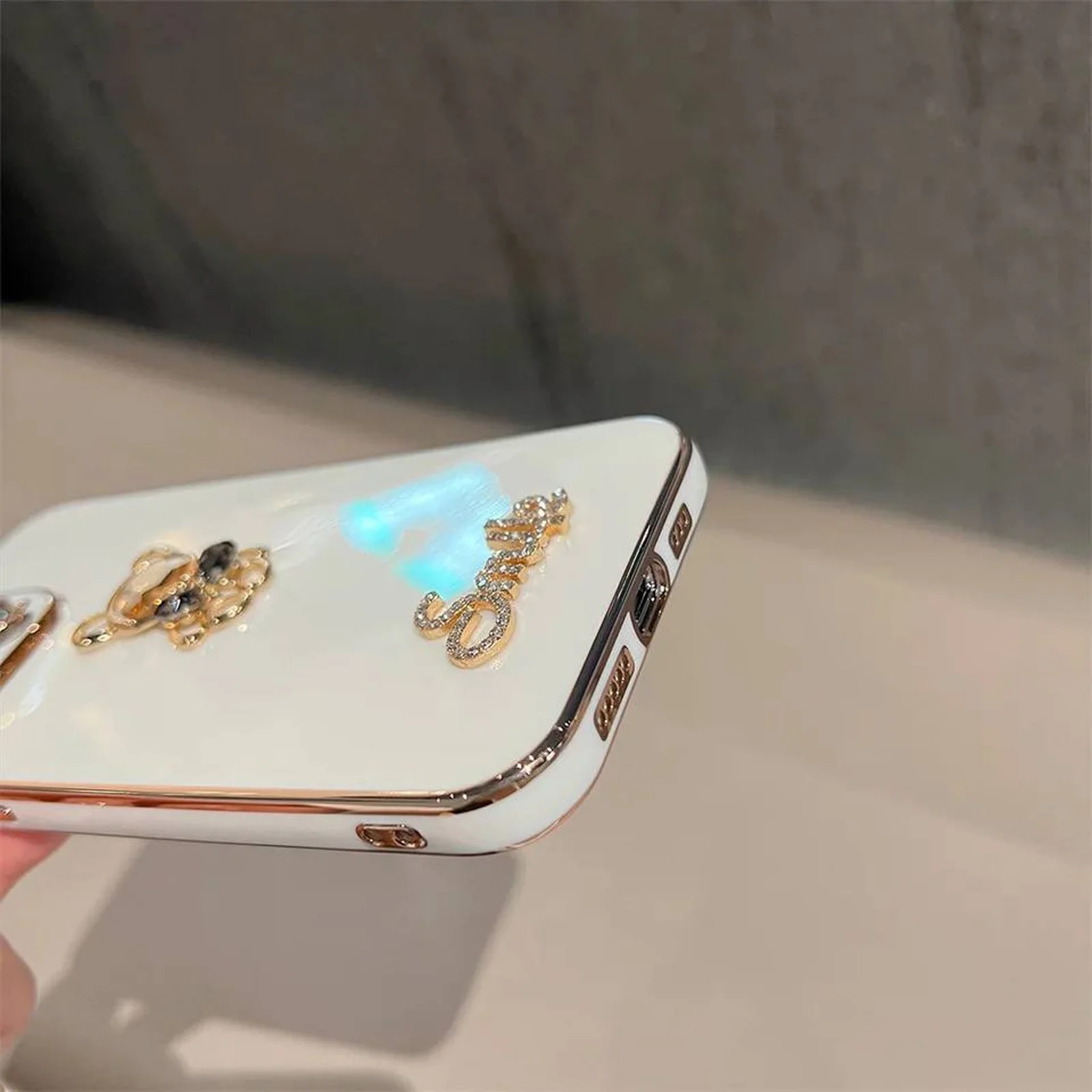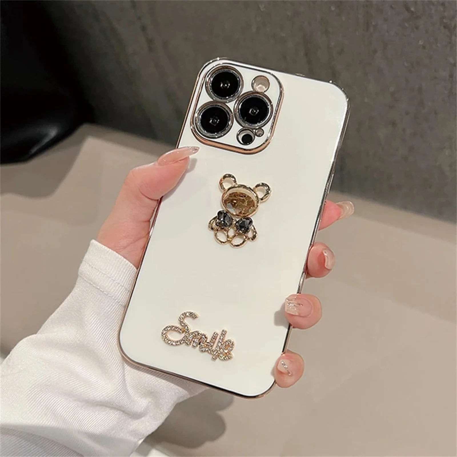 Силиконовый чехол "Gem Bear Bling Smiley" для Apple iPhone 12 Pro Max в белом цвете с золотыми гранями - это уникальный чехол, сделанный вручную с использованием качественных материалов. Он отличается от других чехлов своим оригинальным дизайном.