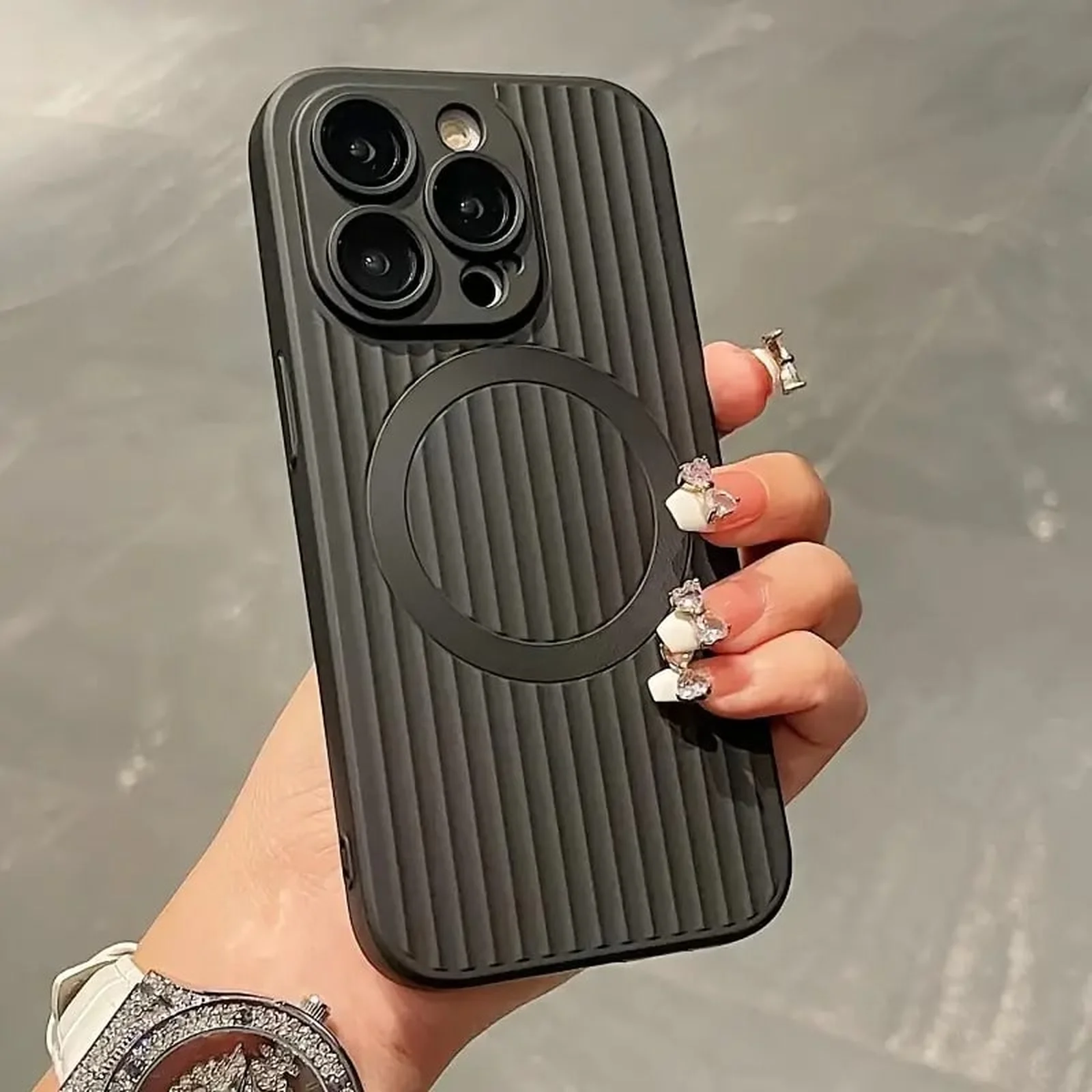 🔒 Оснащенный технологией MagSafe, чехол обеспечивает надежное крепление и совместимость с аксессуарами MagSafe. Ребристая матовая поверхность не только придает устройству особый шарм, но и предотвращает скольжение, обеспечивая удобный хват.