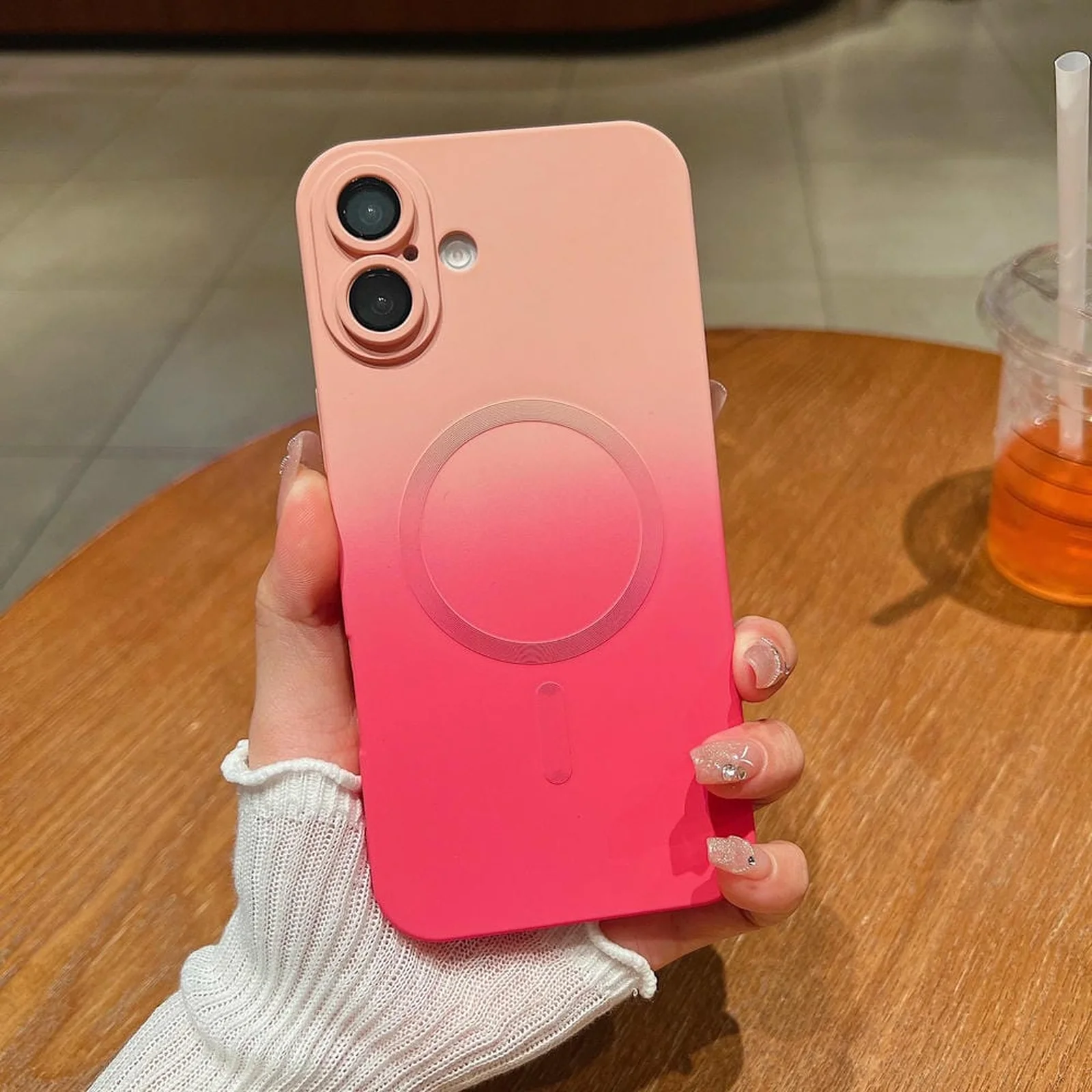Силиконовый чехол «Luxury Gradient» с MagSafe для Apple iPhone 16 — розово-фиолетовый. Не просто защитa, а настроение в аккуратной обёртке. Представьте, как на свету плавный градиент переливается от нежной пудровой розы до глубокого фиолетового оттенка. Этой пленкой хочется не прятать телефон, а показывать его характер. ✨