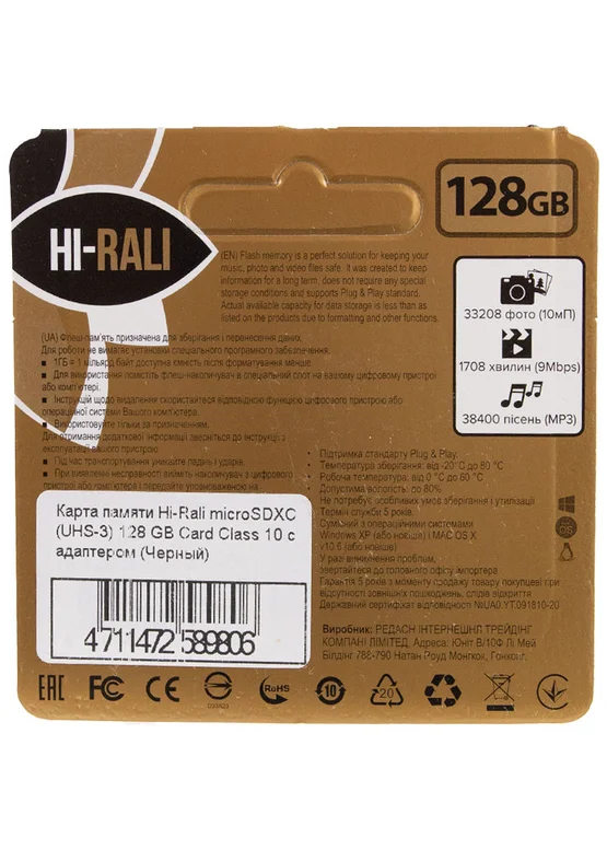 Карта памяти Hi-Rali microSDXC (UHS-3) 128 GB Card Class 10 с адаптером Черный