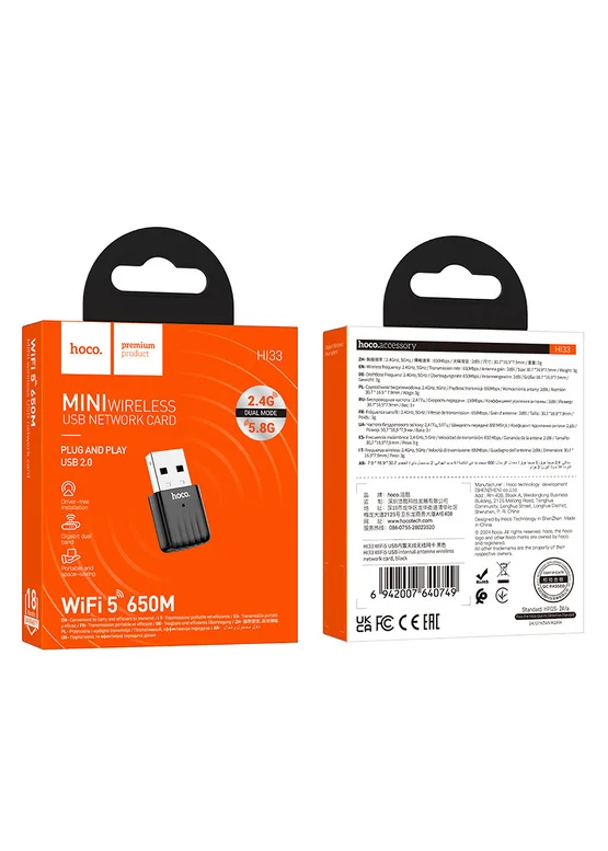 WiFi адаптер Hoco HI33 WiFi5 USB 650Mbps Black