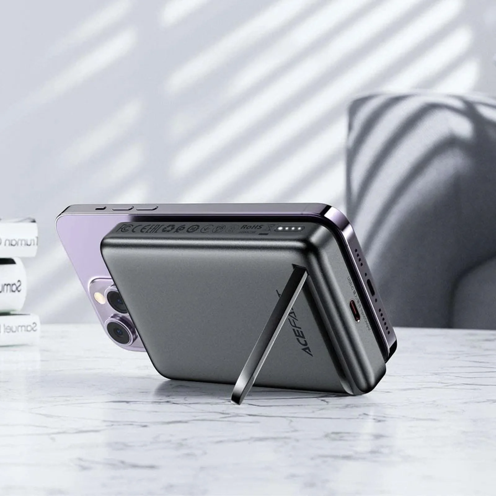 В комплект входит складная подставка, обеспечивающая удобное просмотр фильмов и видео во время зарядки вашего устройства.