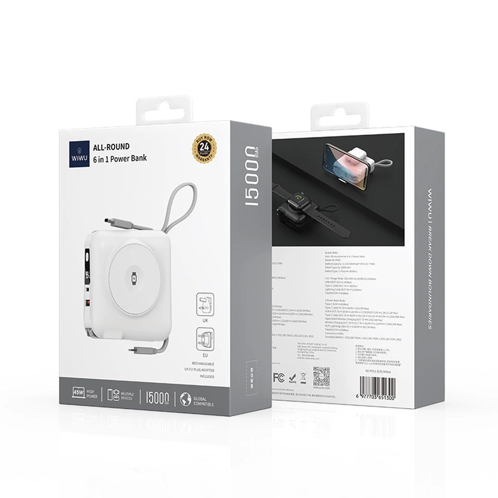 Портативное ЗУ Power Bank WIWU Wi-P051 6 in 1 PD45W с БЗУ 15000 mAh White