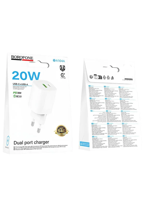СЗУ Borofone BA104A Pudding PD20W+QC3.0 (1USB-A/1C) White