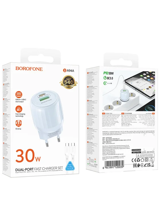 СЗУ Borofone BA94A Lustrous PD30W+QC3.0 (1USB-A/1C) + кабель Type-C to Type-C Blue