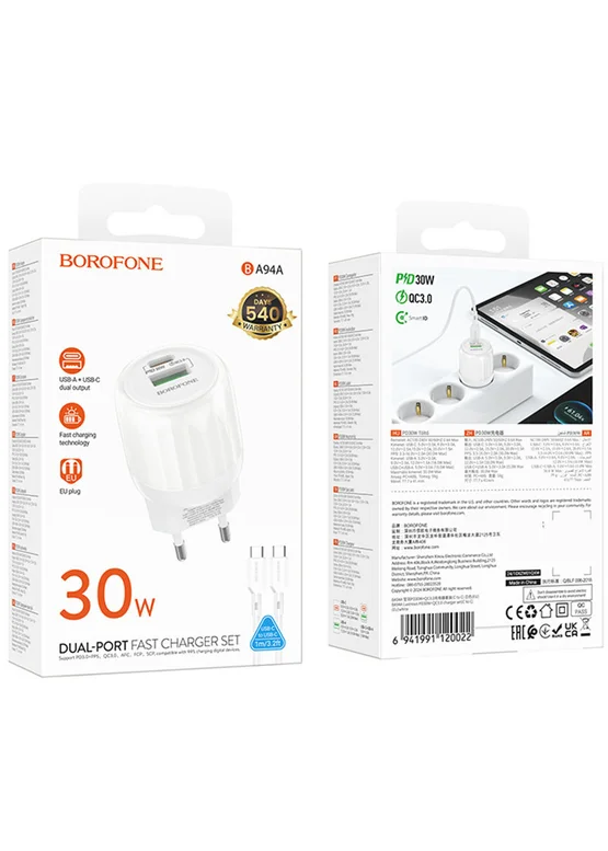 СЗУ Borofone BA94A Lustrous PD30W+QC3.0 (1USB-A/1C) + кабель Type-C to Type-C