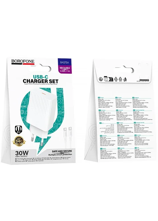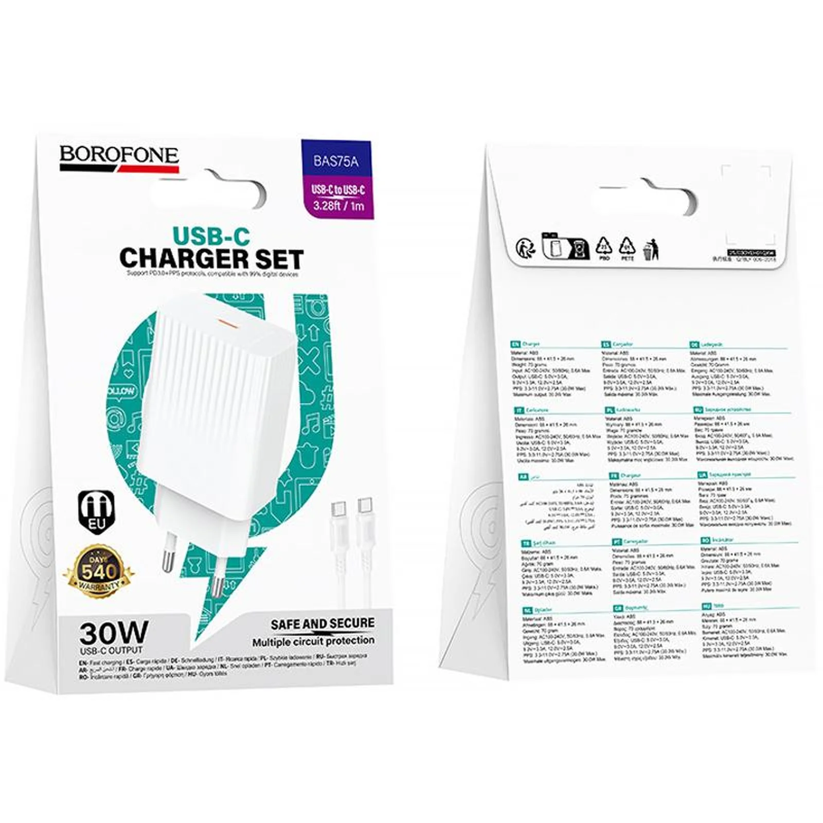 СЗУ Borofone BAS75A Source PD30W (1USB-C) + кабель Type-C to Type-C White