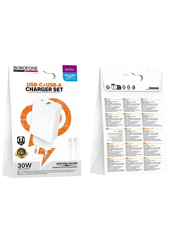 СЗУ Borofone BAS76A Source PD30W+QC3.0 (1USB-A/1C) + кабель Type-C to Type-C White