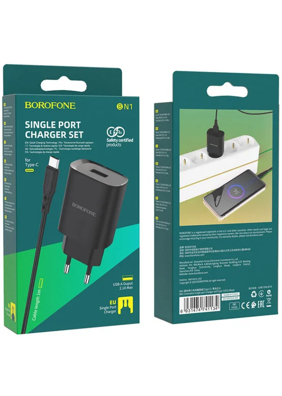 СЗУ Borofone BN1 (1USB/2.1A) + Type-C Черный