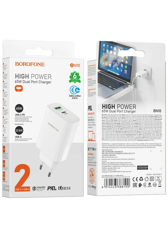 СЗУ Borofone BN10 Sunlight PD65W (1Type-C/1USB) White