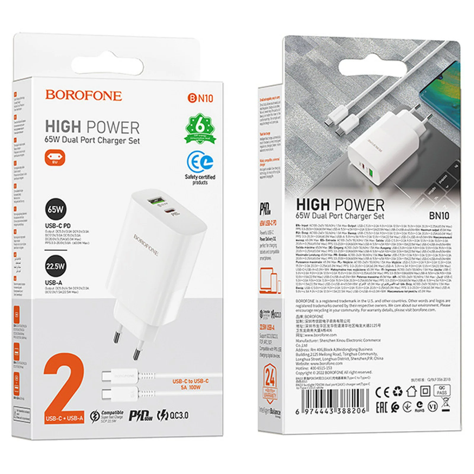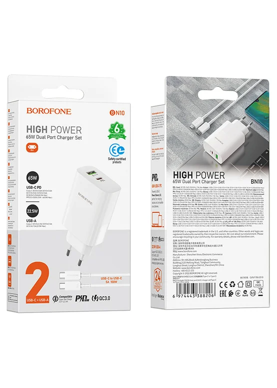 СЗУ Borofone BN10 Sunlight PD65W (1USB-A/1C) + кабель Type-C to Type-C