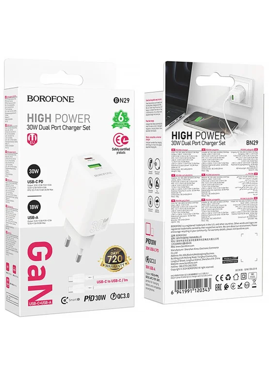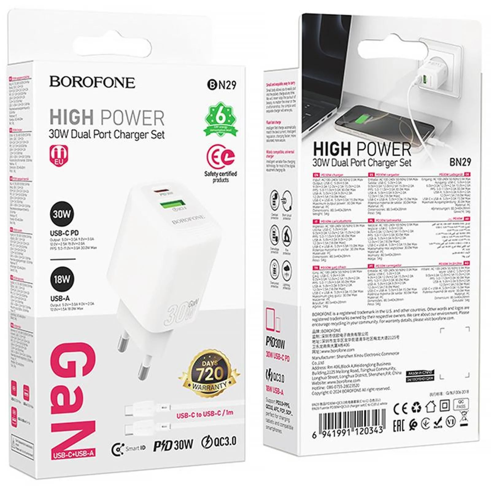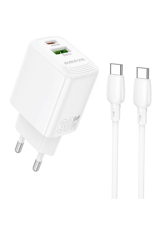 СЗУ Borofone BN29 Fuente PD30W+QC3.0 (1USB-A/1C) + кабель Type-C to Type-C White