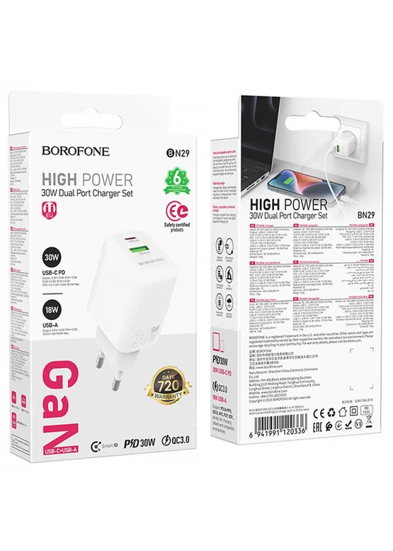 СЗУ Borofone BN29 Fuente PD30W+QC3.0 (1USB-A/1C) White