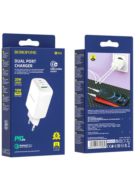 СЗУ Borofone BN4 PD20W+QC3.0 (1USB/1Type-C/3A) Белый