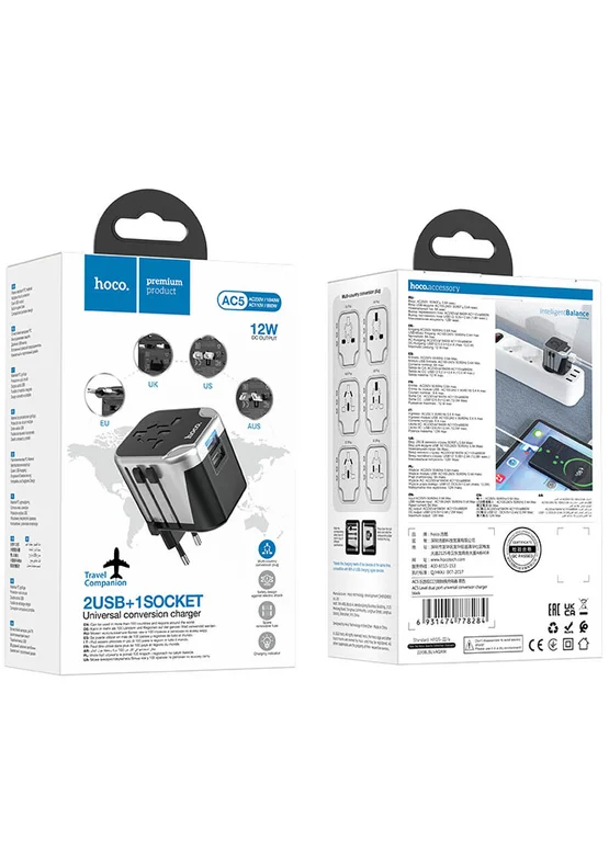 СЗУ Hoco AC5 Level 2USB+Socket Black