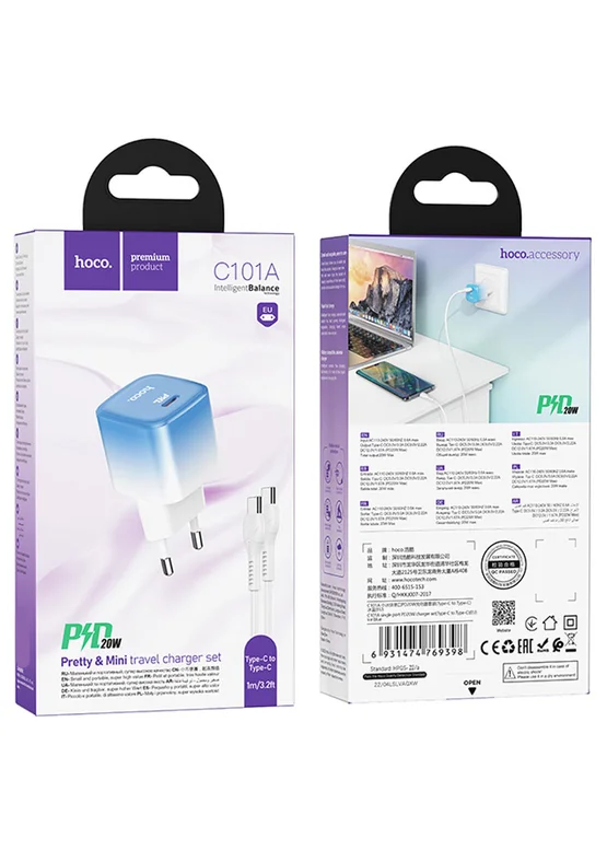 СЗУ HOCO C101A PD20W (1C) + Type-C to Type-C Ice Blue