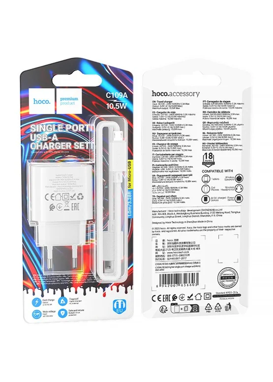 СЗУ Hoco C109A Fighter 10.5W (1USB-A) + кабель USB to MicroUSB White