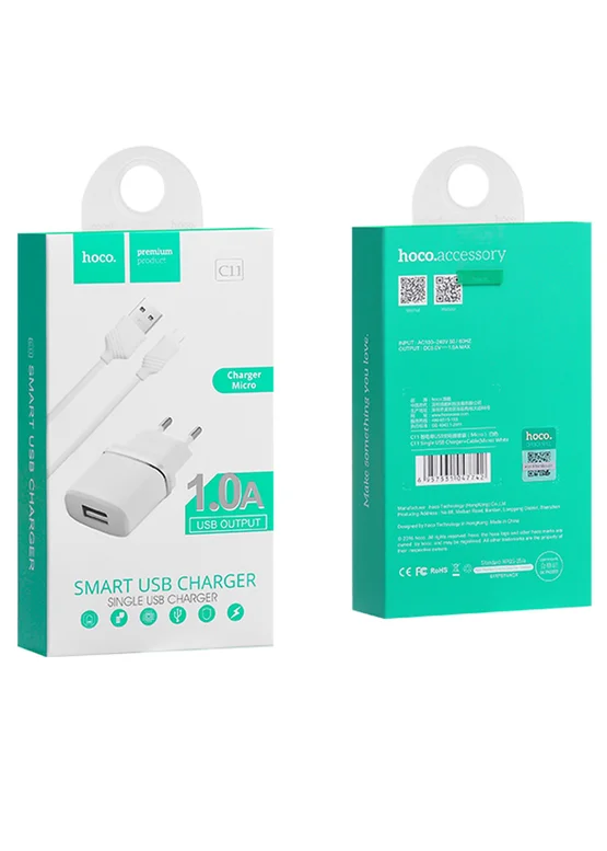 СЗУ Hoco C11 USB Charger 1A (+кабель microUSB 1м) (Белый)