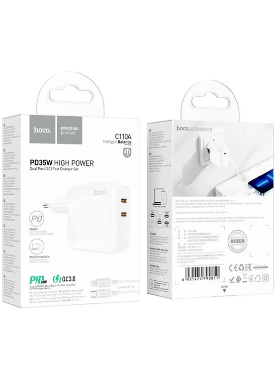 СЗУ Hoco C110A Lucky PD35W (2 Type-C) + Type-C to Type-C White