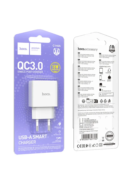 СЗУ Hoco C140A Smart QC3.0 (1USB/3A) White