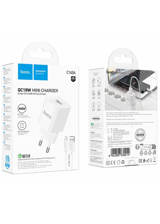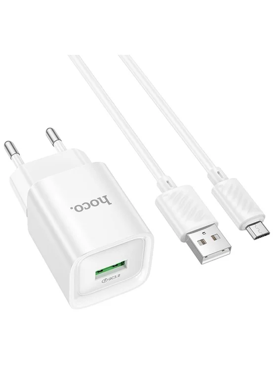 СЗУ Hoco C145A Charm QC3.0 18W (1USB-A) + кабель USB to MicroUSB (White)