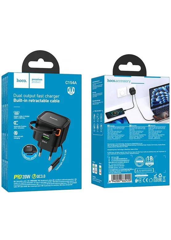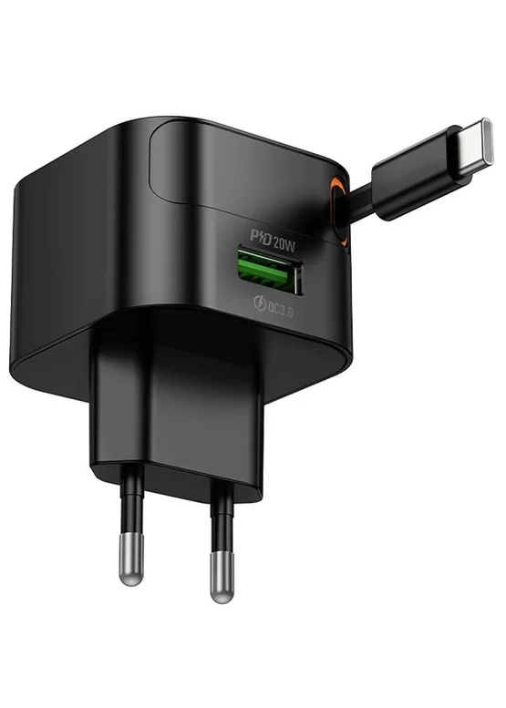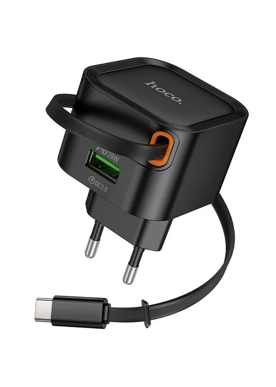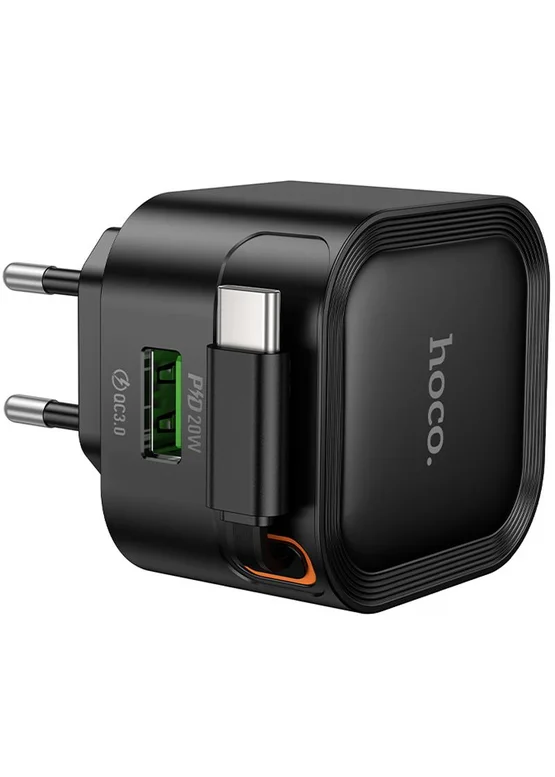 СЗУ Hoco C154A Changer With Retractable Cable Type-C PD20W+QC3.0 (1USB-C) Black