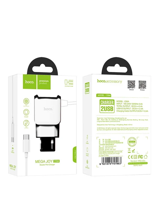 СЗУ Hoco C59A (2USB/2.4A) + Type-C (Белый)