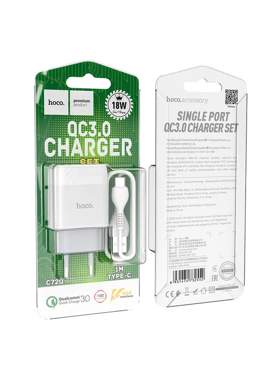 СЗУ Hoco C72Q QC3.0 (1USB/2A) + Type-C Белый