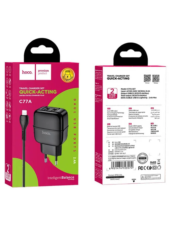 СЗУ Hoco C77A (2USB/2.4A) + Lightning (Черный)