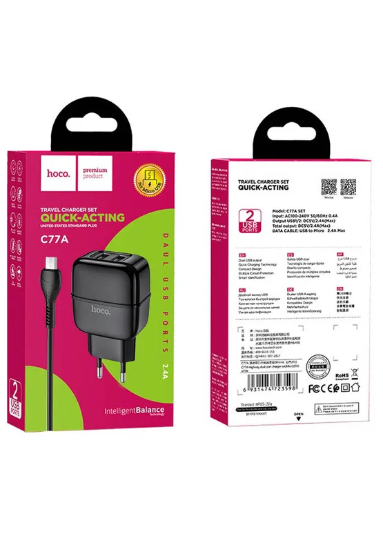 СЗУ Hoco C77A (2USB/2.4A) + MicroUSB (Черный)