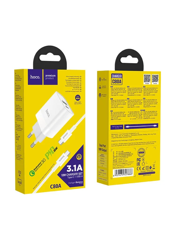 СЗУ HOCO C80A PD+QC3.0 (1USB/3.1A) Type-C to Type-C (Белый)