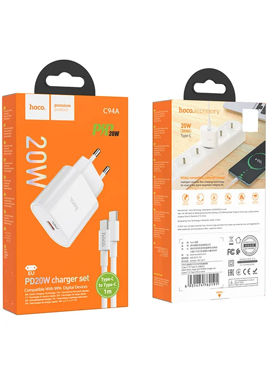СЗУ Hoco C94A Metro PD20W (1C) + Type-C to Type-C White
