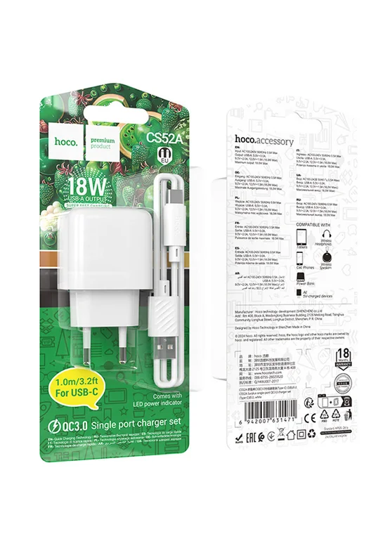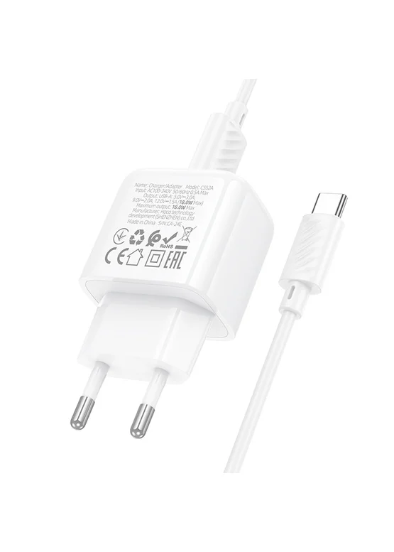СЗУ Hoco CS52A Surplus QC3.0 (1USB-A) + кабель USB to Type-C White