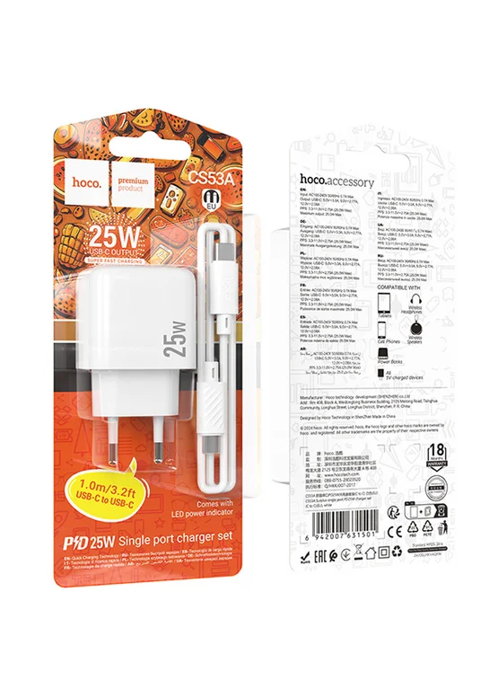 СЗУ Hoco CS53A Surplus PD25W (1USB-C) + кабель Type-C to Type-C White
