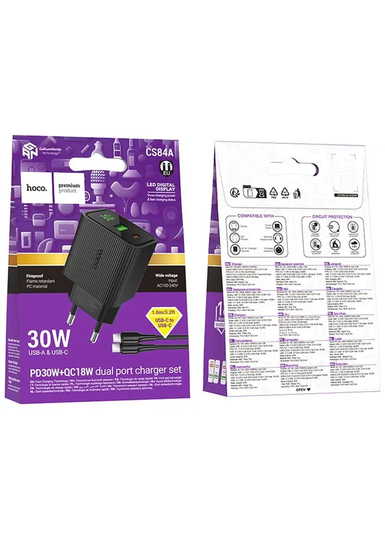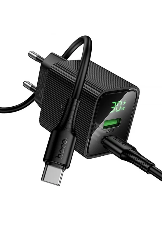 СЗУ Hoco CS84A Excellent with digital display PD30W+QC3.0 (1USB-A/1C) + кабель Type-C to Type-C Black
